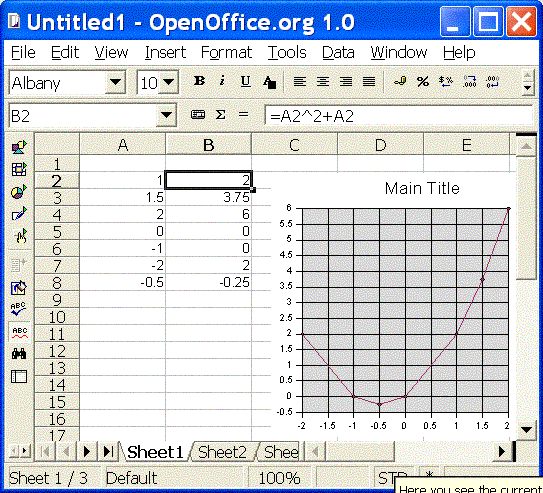 In column A, put a few x values that you want on the graph. In column B, enter the function, replacing “x” with the address of the box immediately to the left. The expression “=A2^2+A2” is in box B2. If you are used to the notation using “^” for exponentiation, you have a head start translating formulas into spreadsheets. You only have to type the expression once, then copy and paste the expression into the rest of the boxes in the column that will get the “Y” values.